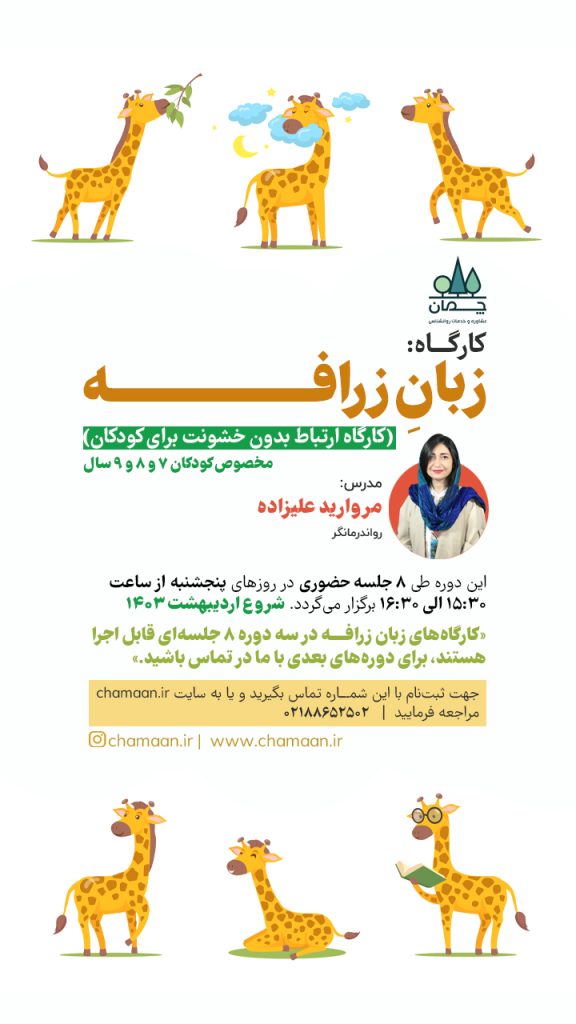 محور اصلی محتوای این کارگاه، آموزش برقراری ارتباط کودک با سایرین به روشی بدون خشونت است. اگر قصد دارید فرزند شما در زمینه برقراری ارتباط با سایرین پیشرفت کرده و مهارتهای بالاتری کسب کند، این کارگاه مناسب شماست. کارگاههای زبان زرافه در سه دوره قابل اجرا هستند برای شرکت در دورههای بعدی با ما در تماس باشید.